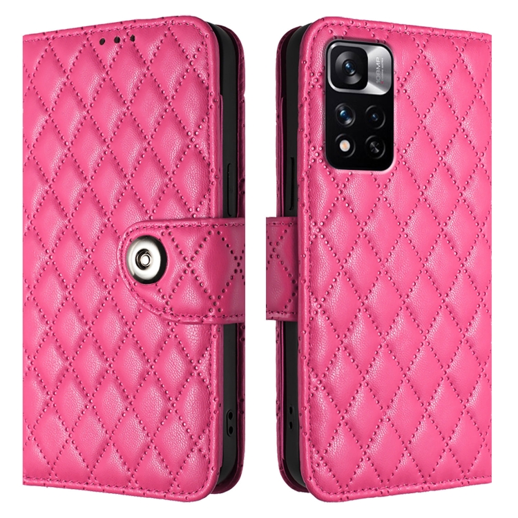 Para Redmi Note 11 Pro + 5G Eu Funda de Cuero con Tapa con Textura Rómbica y Cordón (Rojo Rosa)