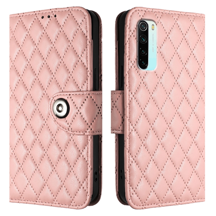 Para Redmi Note 8 Pro Funda de Cuero con Tapa con Textura Rómbica y Cordón (Rosa Coral)