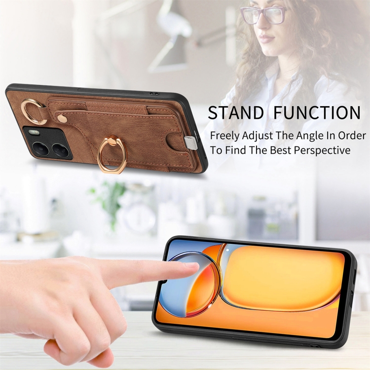 Para Redmi Note 9 4G Funda para Teléfono con Bolsa para Tarjeta con Anillo y Sensación de Piel Retro con Lazo para Colgar (Marrón)