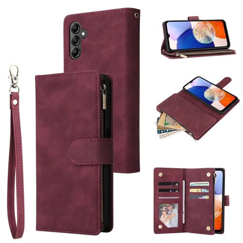 Funda para Samsung Galaxy A15 5G Cuero con Billetera y Cremallera Multifuncional (Rojo Vino)