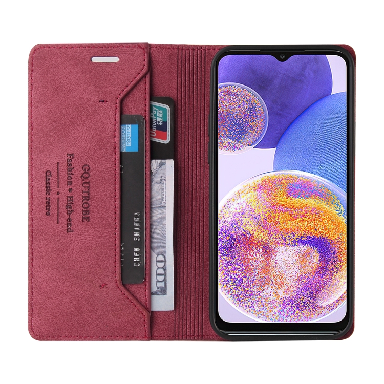 Funda de Cuero para Samsung Galaxy A23 Skin Feel con Tapa Horizontal Cepillo Antirrobo y Soporte (Rojo Vino)