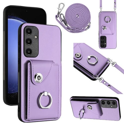 Funda para Teléfono Samsung Galaxy A55 con Soporte para Anillo y Bolsa para Tarjeta con Cordón Largo (Púrpura)