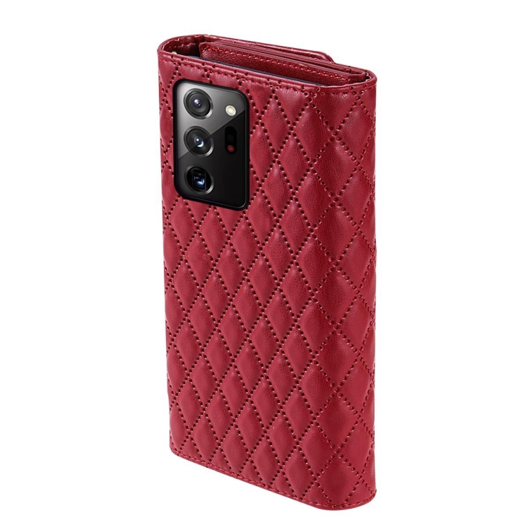 Estuche para teléfono Samsung Galaxy Note20 Ultra con billetera múltiples tarjetas cremallera cuero rómbico (Rojo)