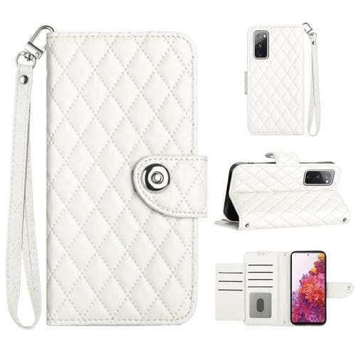 Estuche para Teléfono Samsung Galaxy S20 FE con Tapa de Cuero Textura Rómbica y Cordón (Blanco)