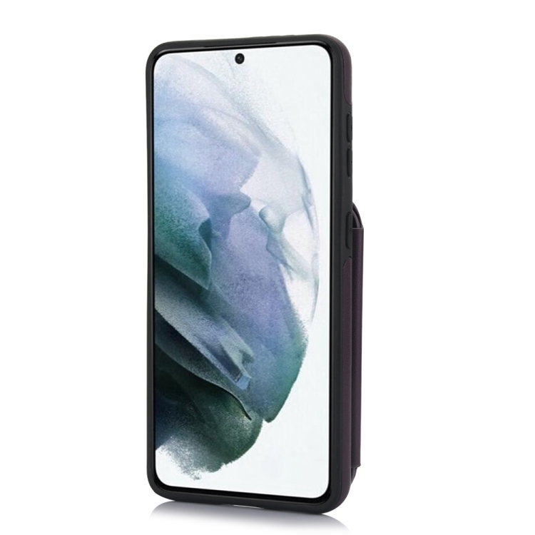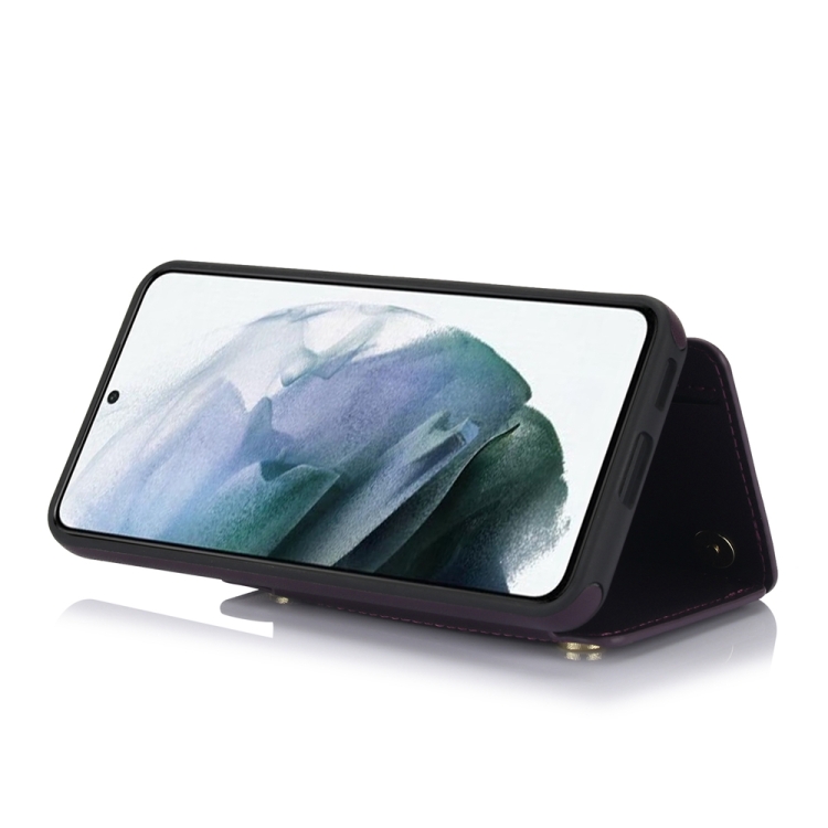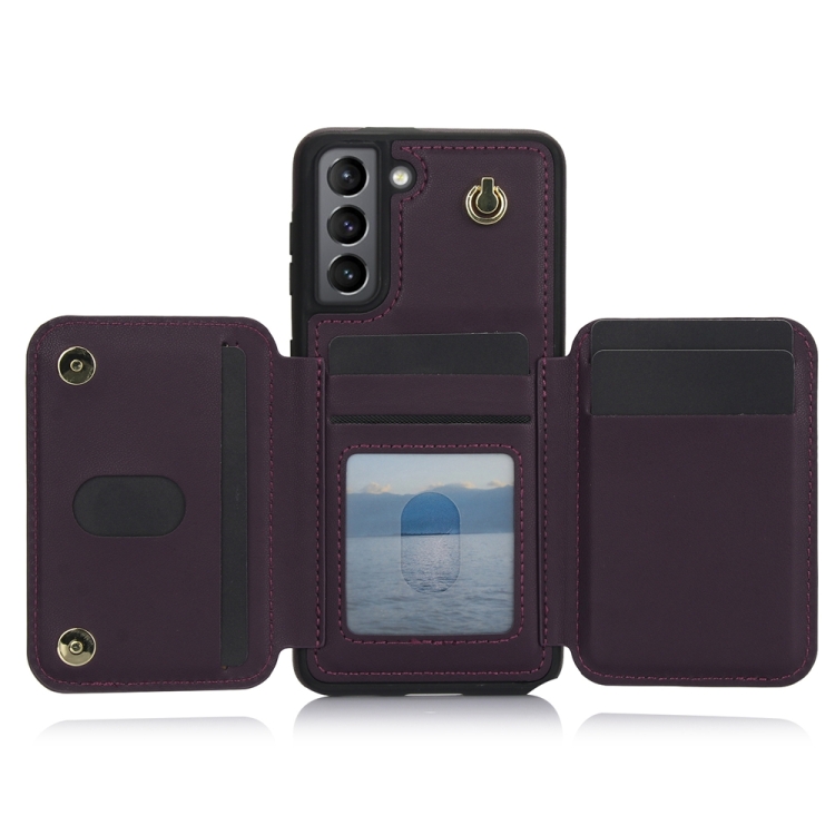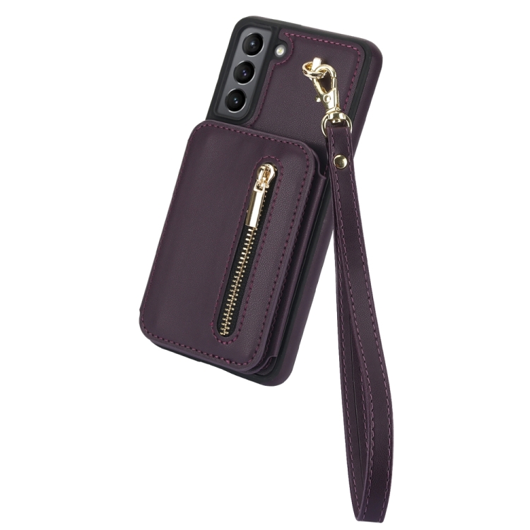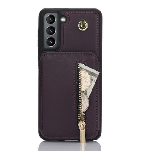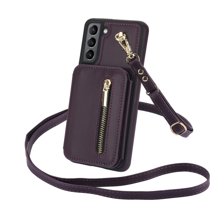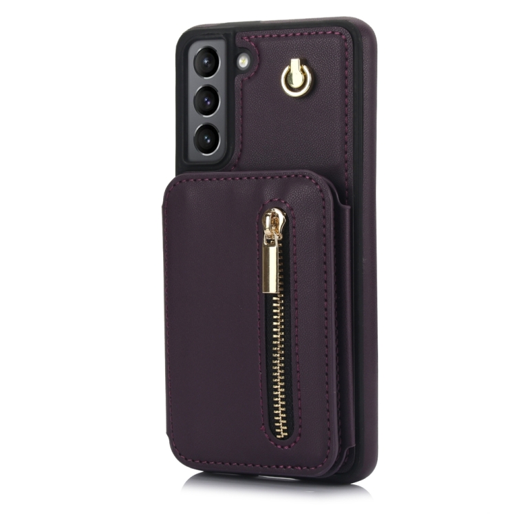 Estuche para teléfono Samsung Galaxy S21 5G Ym006 con bolsa para tarjetas con cremallera y cordón doble (Púrpura Oscuro)