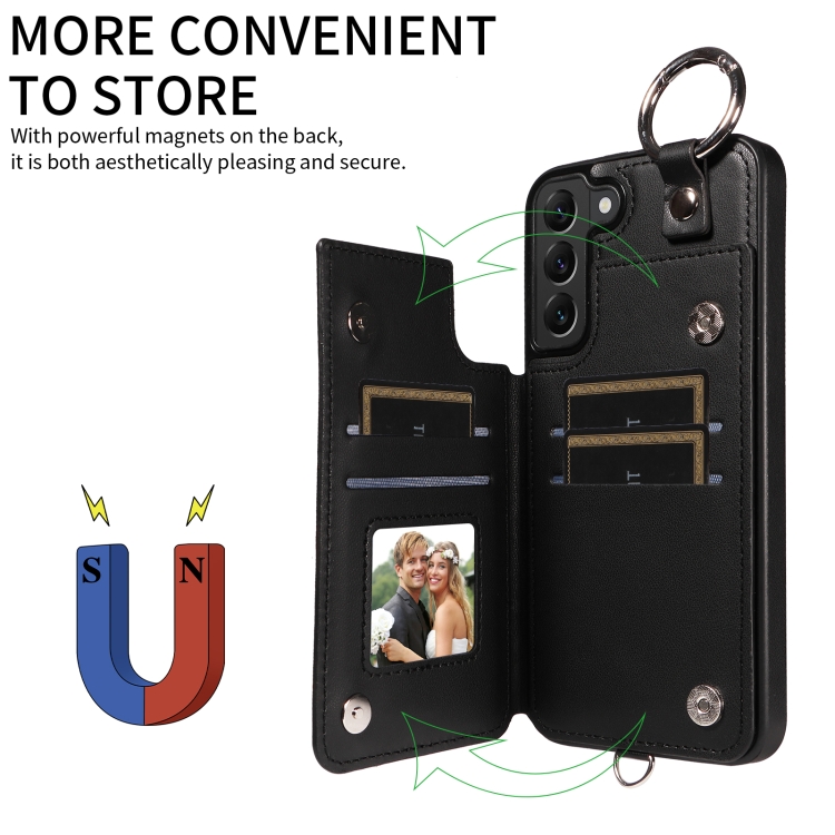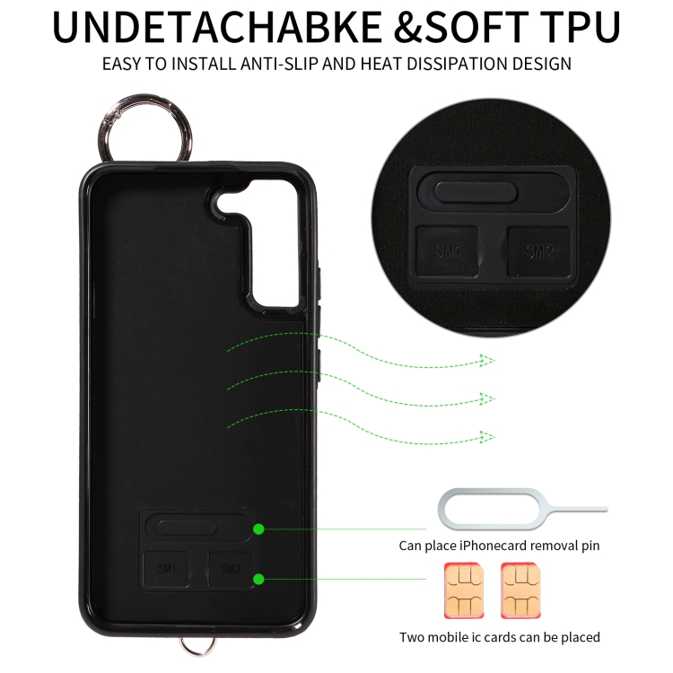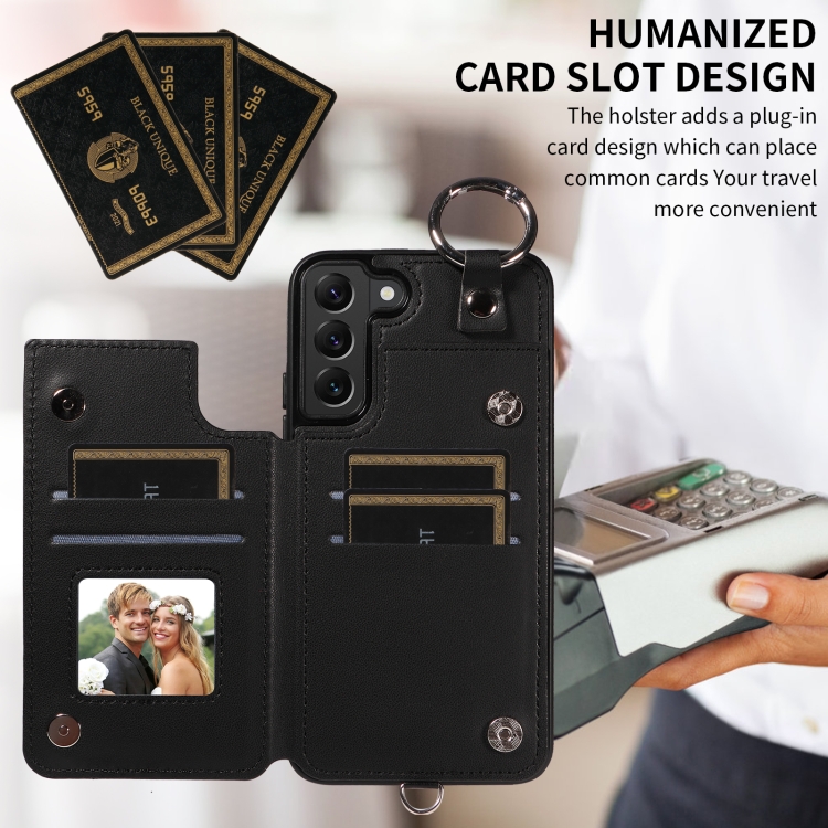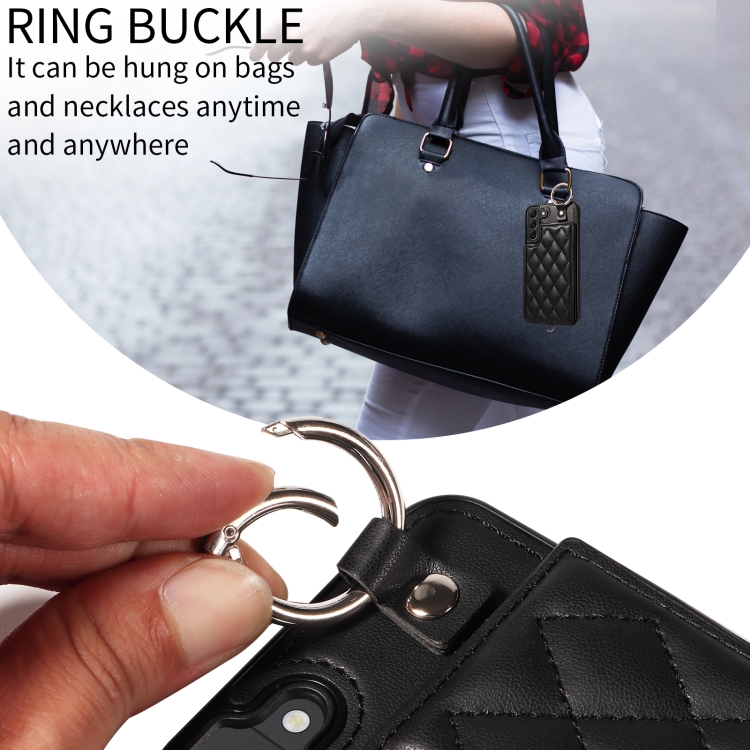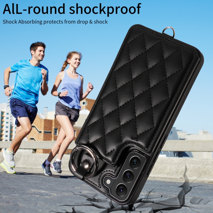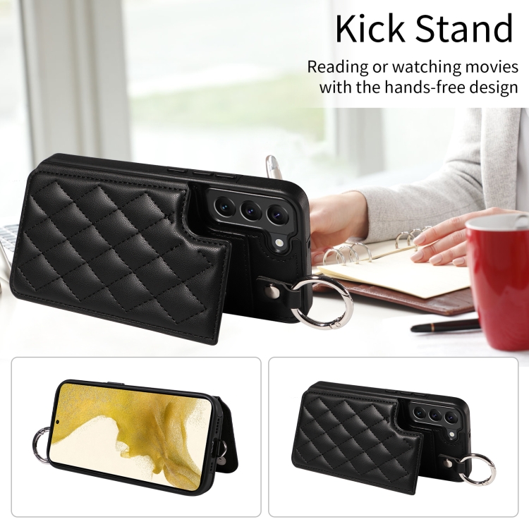 Estuche para Teléfono Samsung Galaxy S22 + 5G con Bolsa para Tarjetas Textura Rómbica y Cordón Corto (Negro)