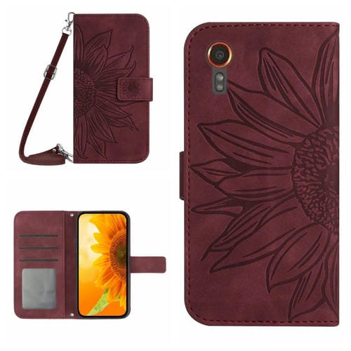 Funda de Cuero Samsung Galaxy Xcover 7 5G Skin Feel Sun Flower con Tapa En Relieve y Cordón (Rojo Vino)