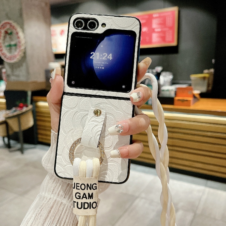Funda Protectora Samsung Galaxy Z Flip5 5G con Patrón de Camelia, Cordón Largo y Anillo de Diamante (Blanco)