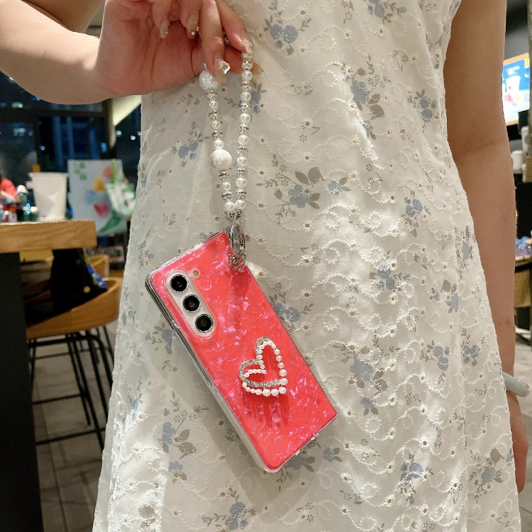 Estuche para Teléfono Samsung Galaxy Z Fold4 con Patrón de Corazón y Textura de Concha Nacarada con Pulsera (Rojo)