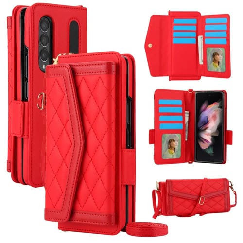 Estuche para Teléfono Samsung Galaxy Z Fold4 con Tarjetero Textura Rómbica y Empalme con Cordón (Rojo)