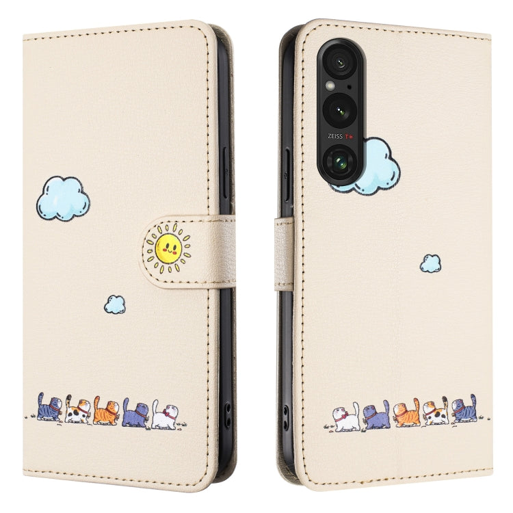 Funda de Cuero para Sony Xperia 1 V con Gatos de Dibujos Animados (Beige Blanco)