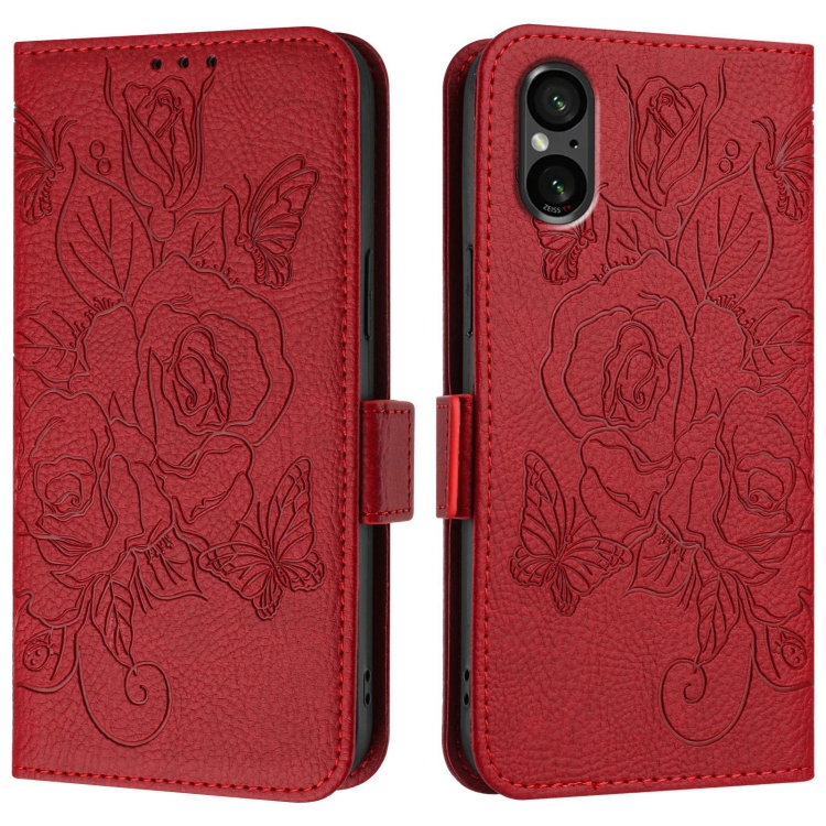 - 1x Estuche para Sony Xperia 5 Vi de Cuero Antirrobo RFID con Rosa en Relieve (Rojo)