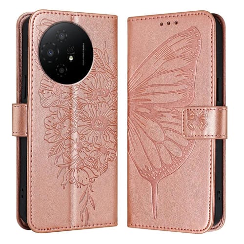 Funda de Cuero para TCL 50 XL 5G con Mariposa en Relieve (Oro Rosa)