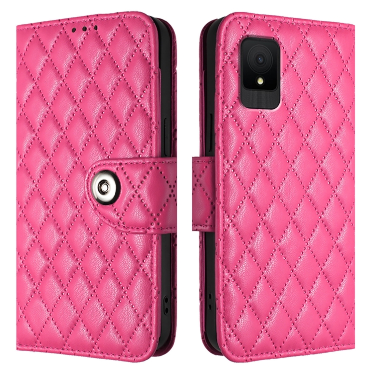 Funda para TCL 502 de Cuero con Tapa, Textura Rómbica y Cordón (Rojo Rosa)