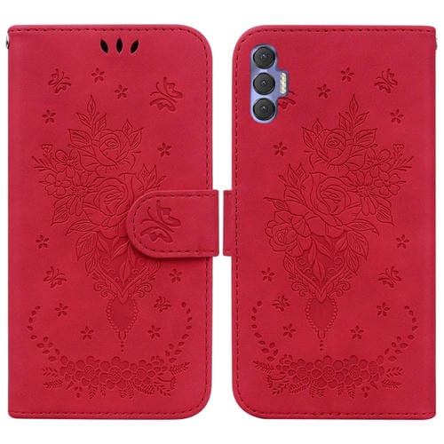 Funda para Tecno Spark 8 Pro Butterfly Rose Foothip en Relieve de Cuero (Rojo)
