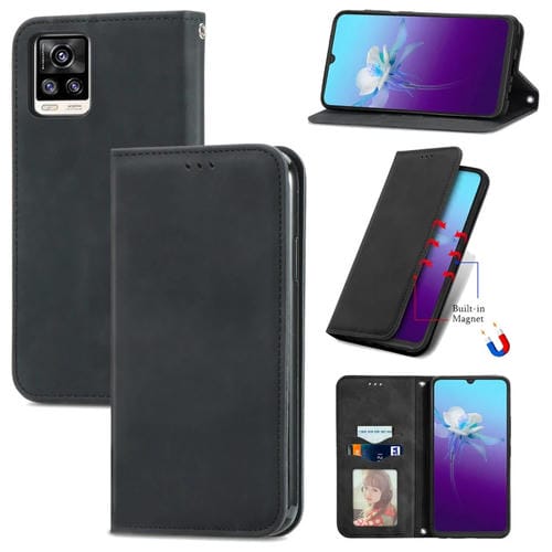 Para Vivo V20 2021 Retro Siente la Piel Magnética Horizontal Flip Funda de Cuero con Soporte y Ranuras para Tarjetas y Marco de Fotografía (Negro)