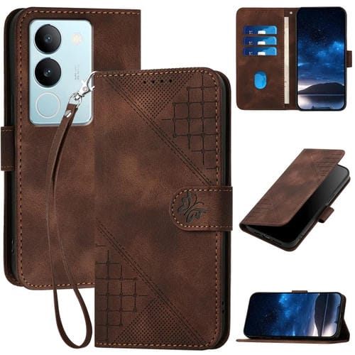 Para Vivo V29 5G Global Yx0080 Grid Butterfly Patrón En Relieve Funda de Cuero con Tapa para Teléfono con Cordón (Café)