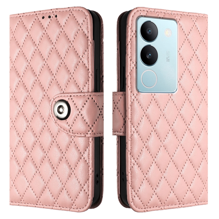 Para Vivo V29 / V29 Pro Funda para Teléfono de Cuero con Tapa con Textura Rómbica y Cordón (Rosa Coral)