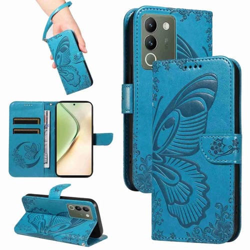 Para Vivo V29E / Y200 5G Funda para Teléfono de Cuero con Relieve de Mariposa y Cola de Golondrina (Azul)