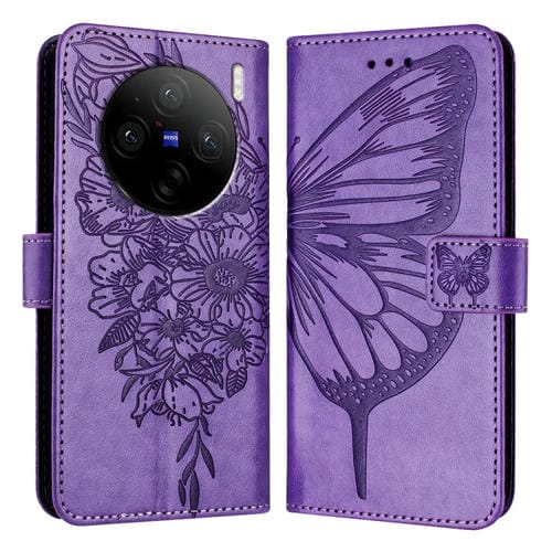 Para Vivo X100S 5G Funda de Cuero con Mariposa En Relieve (Púrpura Claro)