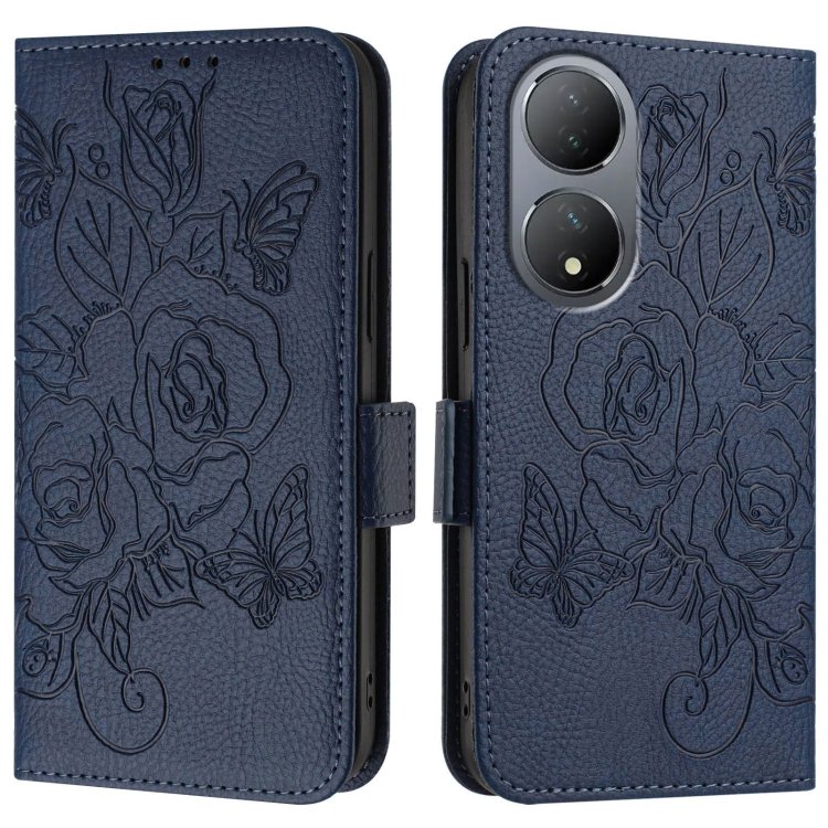 Para Vivo Y100 5G Global Embossed Rose Rfid Funda de Cuero Antirrobo para Teléfono (Azul Oscuro)