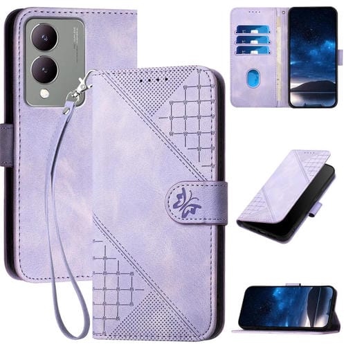 Para Vivo Y28 5G India Yx0080 Funda de Cuero con Tapa y Patrón En Relieve de Mariposa En Cuadrícula con Cordón (Morado Claro)