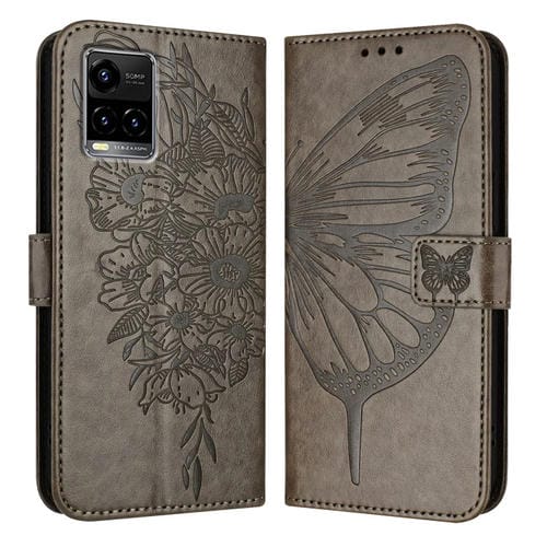 Para Vivo Y33S 4G Global / Y21 2021 / Y21S Funda para Teléfono de Cuero con Mariposa En Relieve (Gris)
