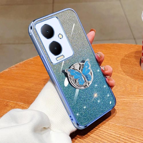 Para Vivo Y78 + Funda para Teléfono de TPU con Soporte de Mariposa con Brillo Degradado Plateado (Azul Sierra)