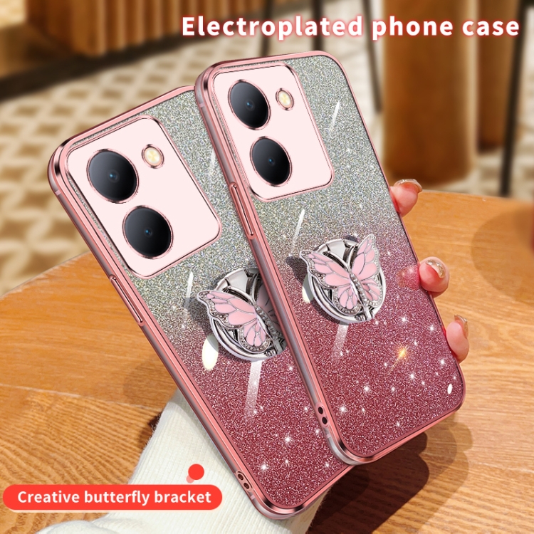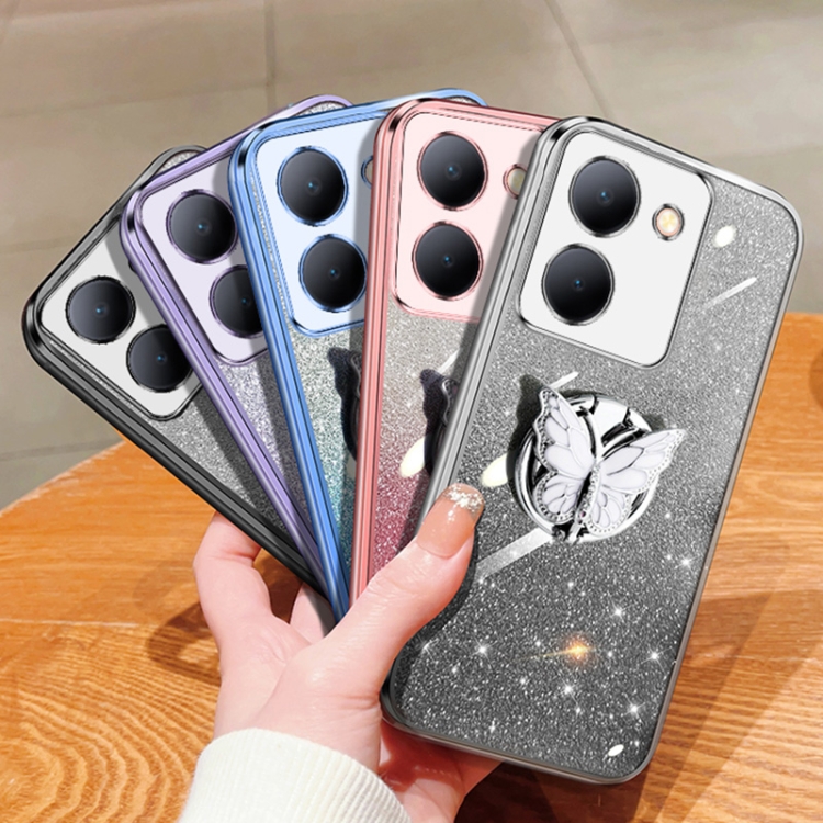 Para Vivo Y78 Funda para Teléfono de TPU con Soporte de Mariposa con Brillo Degradado Plateado (Negro)
