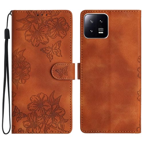 Para Xiaomi 13 Cherry Blossom Butterfly Skin Feel Funda para Teléfono de Pu En Relieve (Marrón)
