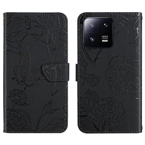 Para Xiaomi 13 Ht03 Skin Feel Butterfly Funda de Cuero con Tapa En Relieve para Teléfono (Negro)