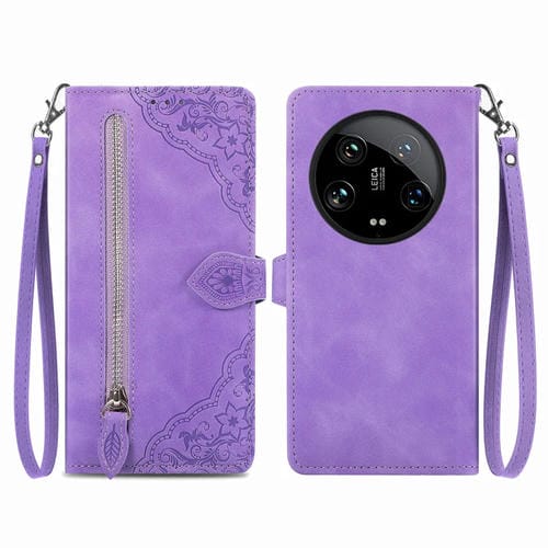 Para Xiaomi 14 Funda De Cuero Con Cremallera Y Flores En Relieve Ultra (Púrpura)