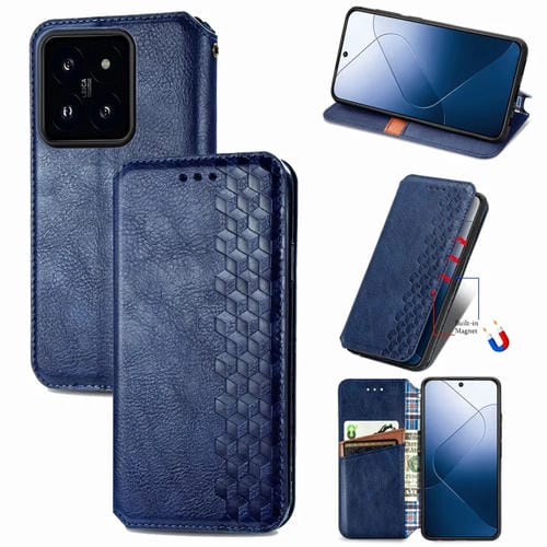 Para Xiaomi 14 Pro Cubic Grid Funda De Teléfono De Cuero Magnético Prensado (Azul)