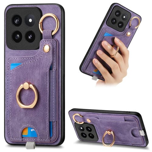 Para Xiaomi 14 Pro Funda Para Teléfono Con Bolsa Para Tarjeta Con Anillo Y Sensación De Piel Retro Con Lazo Para Colgar (Púrpura)