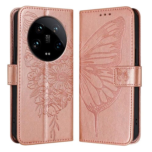 Para Xiaomi 14 Ultra 5G Funda De Teléfono De Cuero Con Mariposa En Relieve Global (Oro Rosa)