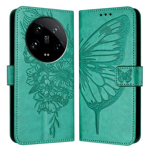Para Xiaomi 14 Ultra 5G Funda Para Teléfono De Cuero Con Mariposa En Relieve Global (Verde)