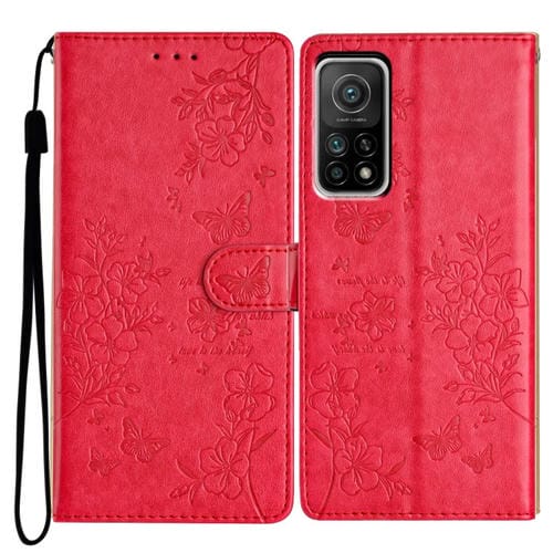 Para Xiaomi Mi 10T Pro 5G Funda de Cuero para Teléfono con Mariposas y Flores (Rojo)