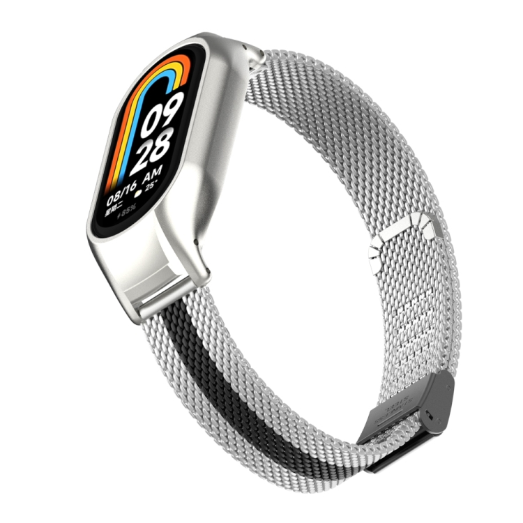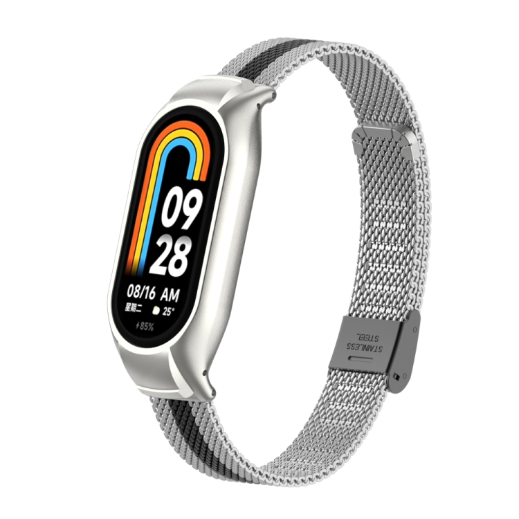 Caja de Metal Integrada para Xiaomi Mi Band 8 + Correa de Reloj con Hebilla de Malla de Acero (Plata + Negro)