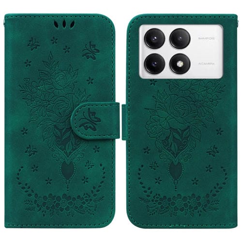 Para Xiaomi Poco F6 Pro Butterfly Rose Funda de Cuero para Teléfono En Relieve (Verde)