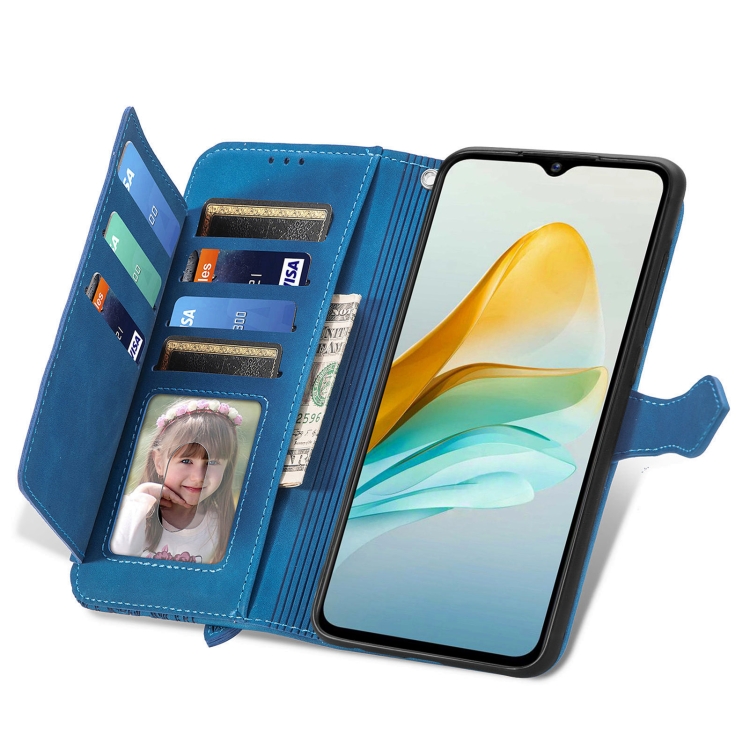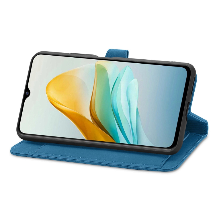 Funda de Cuero para ZTE Blade A53 con Cremallera y Flores en Relieve (Azul)