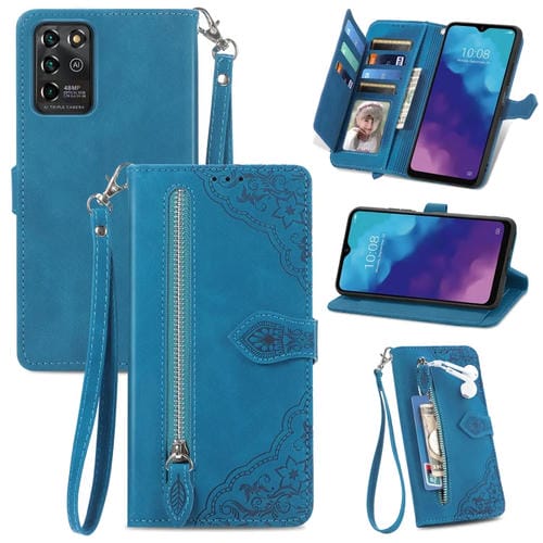 Estuche para ZTE Blade V30 Vita de Cuero con Cremallera y Flores en Relieve (Azul)