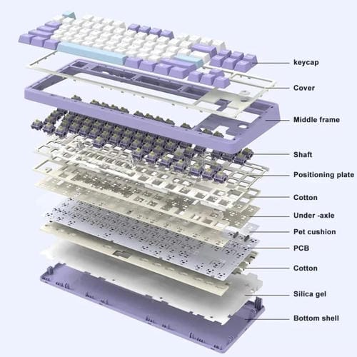 - Disposición de 87 teclas, interruptores mecánicos en caliente compatibles con ejes de tres y cinco pines tipo MX, Batería de 4000 mAh, efectos de iluminación RGB con 20 grupos preestablecidos, estructura de junta de 5 capas para reducción de ruido, peso aproximado de 970 g, dimensiones de 37 x 14,8 x 2,1 cm