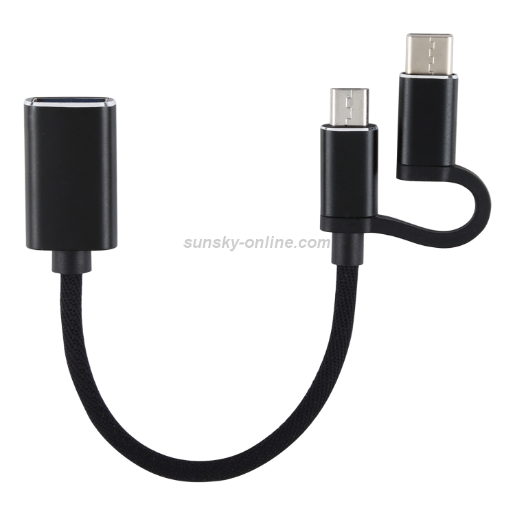 Adaptador Usb 3.0 Hembra A a Micro Usb + Usb-C Tipo-C Carga y Transmisión Otg Nylon (Negro) 11 cm