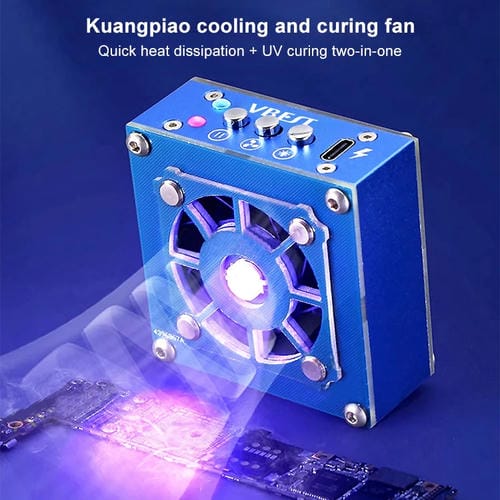 El Ventilador de curado UV VBST-491 es un dispositivo diseñado para ofrecer un enfriamiento rápido y eficiente en procesos de reparación y curado de materiales fotosensibles. Este modelo genérico es compatible con diversas aplicaciones Técnicas que requieren la solidificación rápida de pegamentos y otros compuestos mediante luz ultravioleta. Su función principal es mantener la temperatura óptima del área de trabajo, evitando el sobrecalentamiento gracias a su sistema de refrigeración integrado. Además, cuenta con una capacidad de Batería de 1200 mAh que permite su uso Portátil, facilitando reparaciones en diferentes entornos. El Ventilador ofrece una velocidad de viento ajustable en tres niveles y un funcionamiento silencioso, lo que contribuye a un ambiente de trabajo cómodo y profesional.