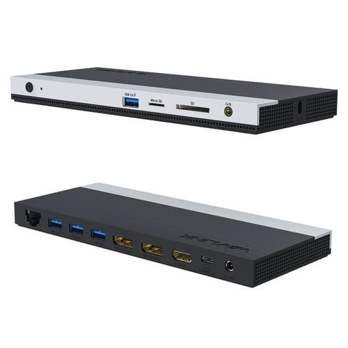 - Incluye 2 Puertos DisplayPort 1.4, 1 Puerto HD 2.0, 1 Puerto Gigabit Ethernet RJ45 (10/100/1000 Mbps), 4 Puertos USB 3.0 (uno con Carga rápida BC1.2), ranuras para Tarjetas SD y TF, Puerto de audio de 3,5 mm, Soporte para Carga rápida PD hasta 65W, Soporte para Pantallas múltiples con resoluciones hasta 4K 60 Hz y compatibilidad con sistemas Windows 7/8/10 y Mac OS