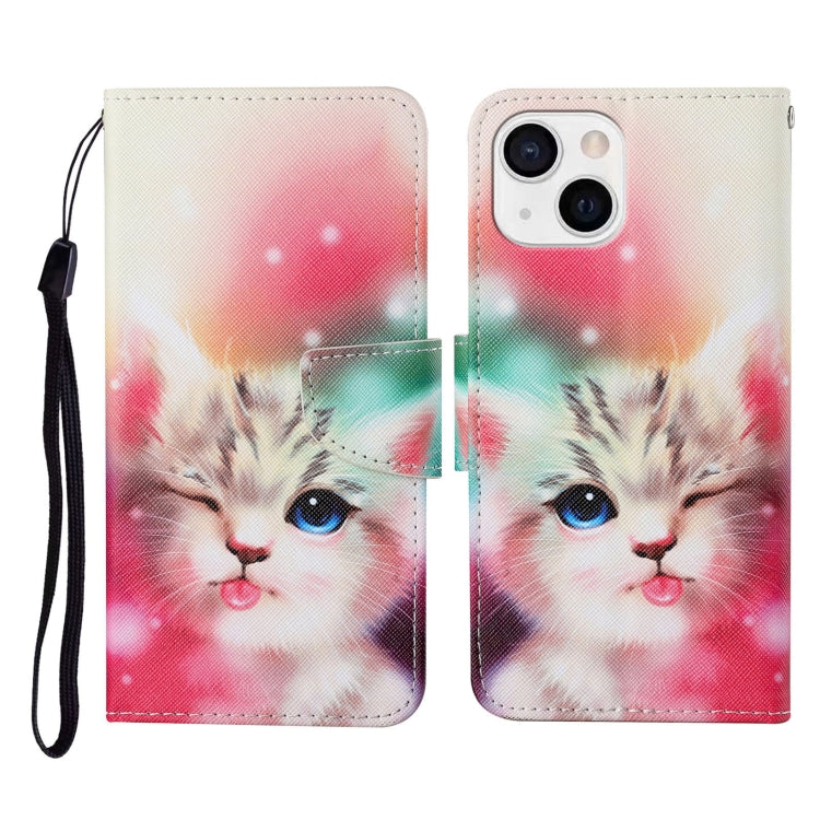 Funda de Cuero para iPhone 13 Mini con Tapa Horizontal y Patrón de Dibujo Coloreado (Squint Cat)