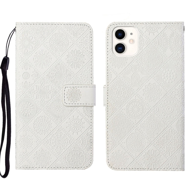Estuche de teléfono iPhone 13 Mini cuero patrón en relieve estilo étnico (Blanco)