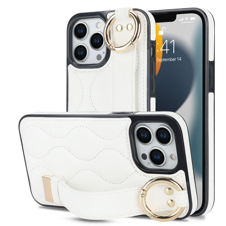 Funda para iPhone 13 Pro Antideslizante de PU con Anillo y Muñequera (Blanco)