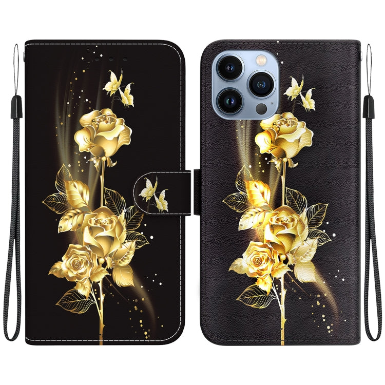 Estuche para Teléfono iPhone 15 Pro Max Cuero Dibujo Coloreado Textura Cristal (Mariposa Dorada Rosa)