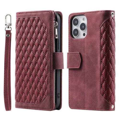 Funda de Cuero para iPhone 16 Pro Max con Cremallera y Textura de Cuadrícula con Cordón (Rojo Vino)